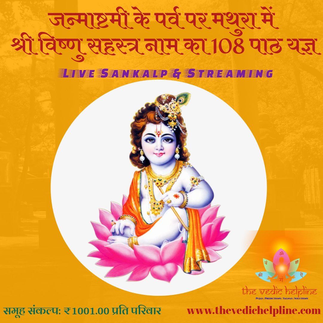 Shree Vishnu Shahastra Naam 108 times on the occasion of Janmastmi festival at the birth place Mathura is regarded as very auspicious. In current Covid era, we offer Group Sankalp for this puja to all Devotees of Lord Krishna at just ₹1001.00 per family.
